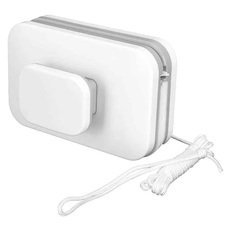 - Безопасность обеспечивается двумя уровнями защиты: прочной страховочной веревкой длиной 2,5 метра и системой из 4-х мощных магнитов. Даже при случайном ослаблении магнитного притяжения внешняя часть щетки останется привязанной и не упадет.