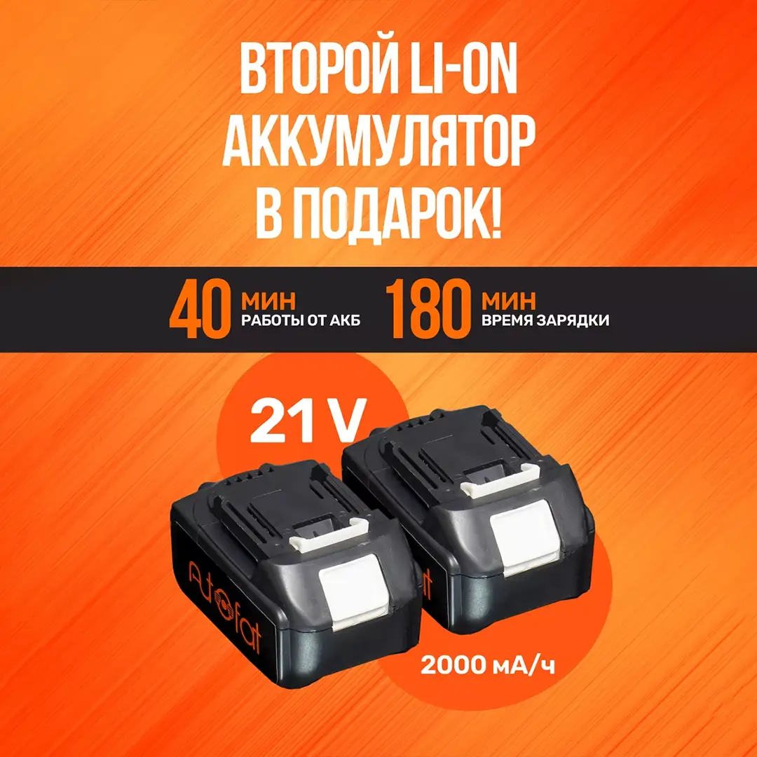 - Аккумулятор обеспечивает до 40 минут интенсивной эксплуатации на максимальных оборотах. При выполнении менее энергозатратных операций данный показатель может возрасти до 1,5 часов. Функция индикации заряда предупредит о необходимости подзарядки заблаговременно.