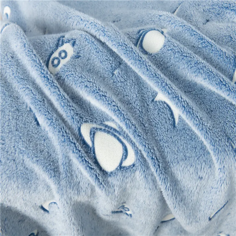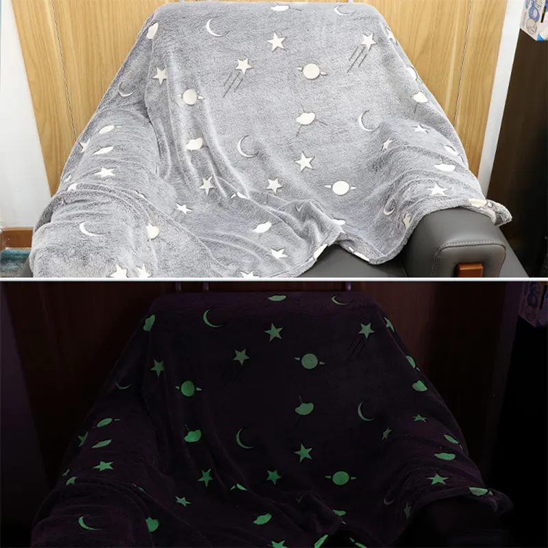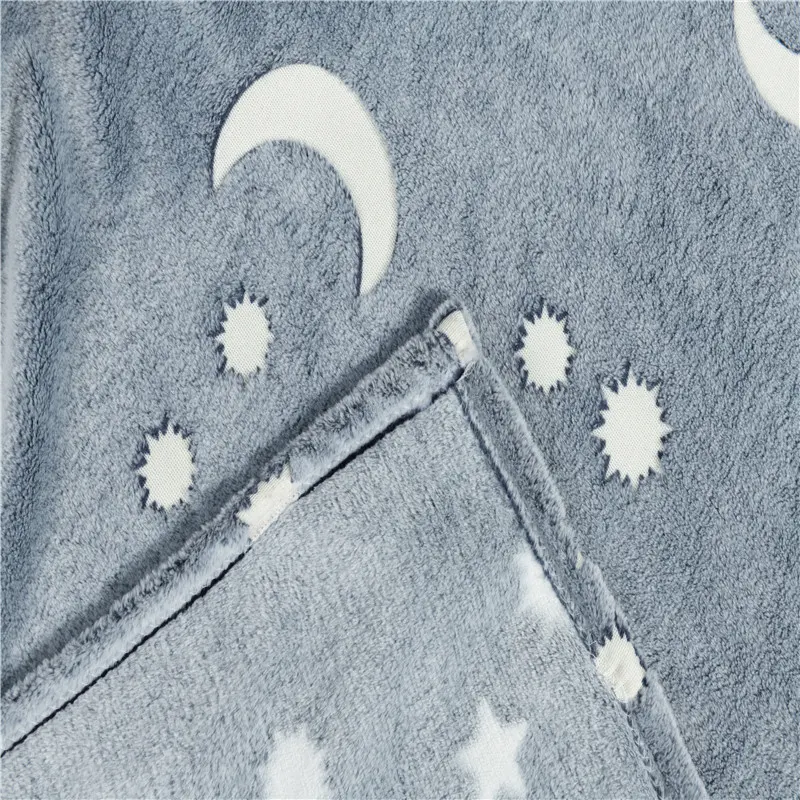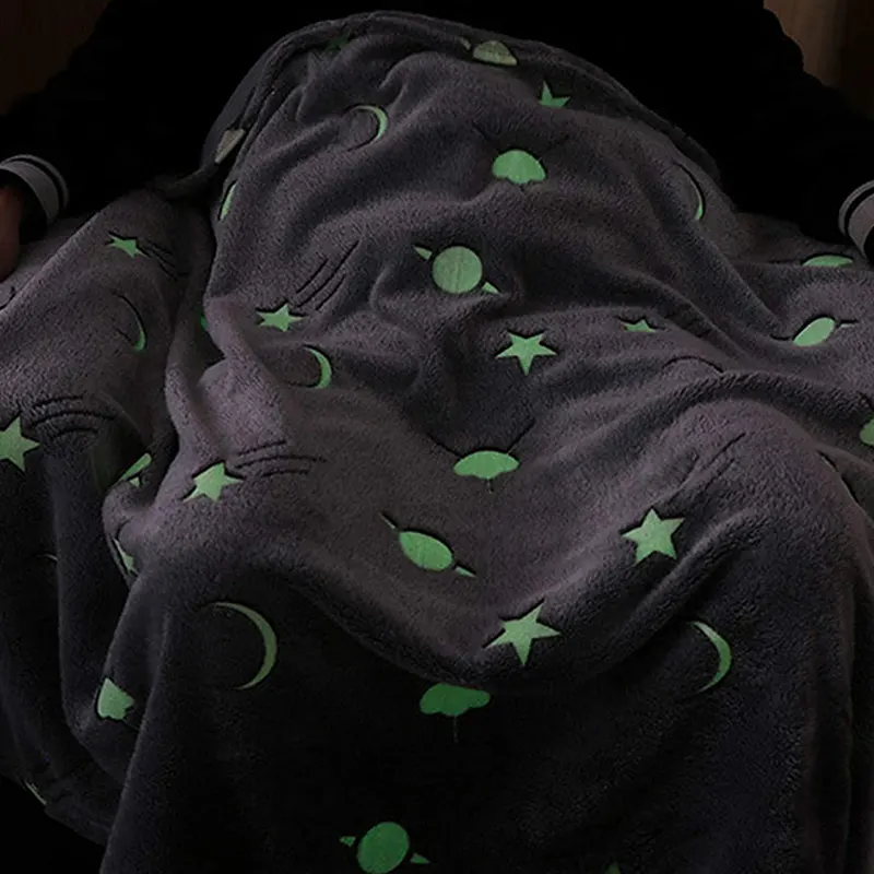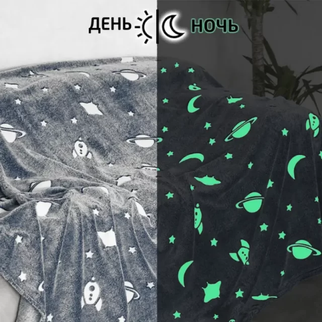 Плед, светящийся в темноте — это удивительное покрывало, которое создает уютную атмосферу в комнате и дарит ощущение волшебства. Плед светится в темноте и на нем изображены звезды, планеты, ракеты и месяц, что делает его идеальным для создания космической атмосферы в комнате. При свете дня плед выглядит как обычное покрывало, а ночью создает впечатляющий светящийся эффект. Плед мягкий и тёплый, идеально подходит для использования на диване или кровати.