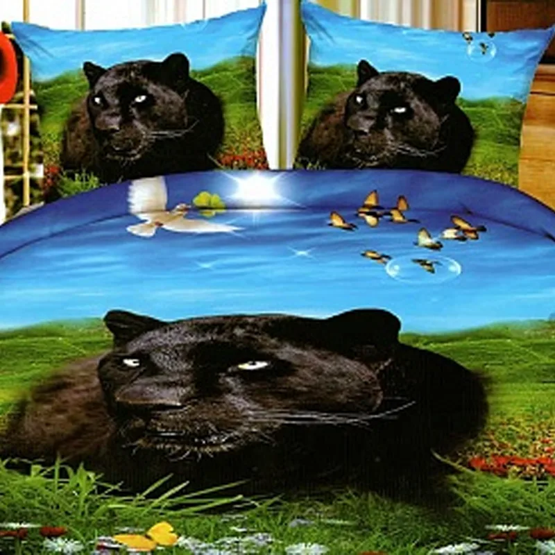 Потрясающий комплект постельного белья с пантерой Багирой станет уникальным и стильным дополнением любой спальни. На пододеяльнике изображена фантастическая фотография красивой черной пантеры на зелёном фоне. Этот пододеяльник можно стирать в машине и сушить в сушильной машине. Размер 1.5 сп. Материал - сатин.
