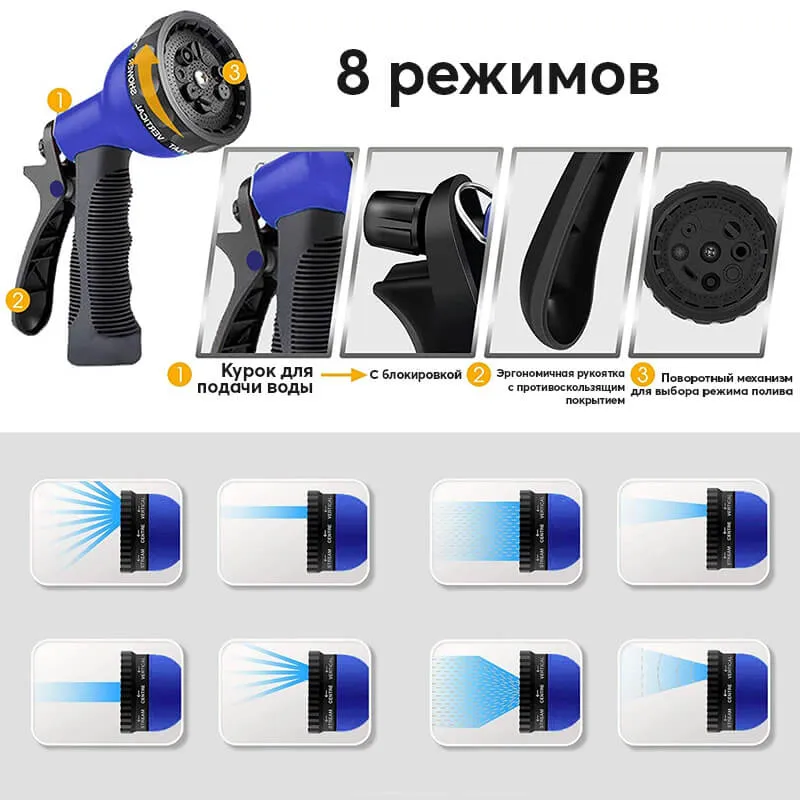 Многофункциональный распылитель, входящий в комплект, предлагает 8 режимов работы:
