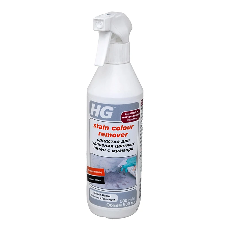 Средство для удаления цветных пятен с мрамора "HG" удаляет следы от кофе, чая, вина, а также другие цветные пятна и загрязнения с мрамора и других видов известковых натуральных камней. Подходит для очистки памятников и надгробий.