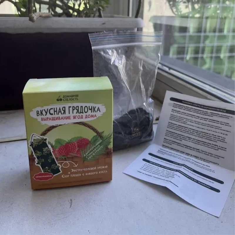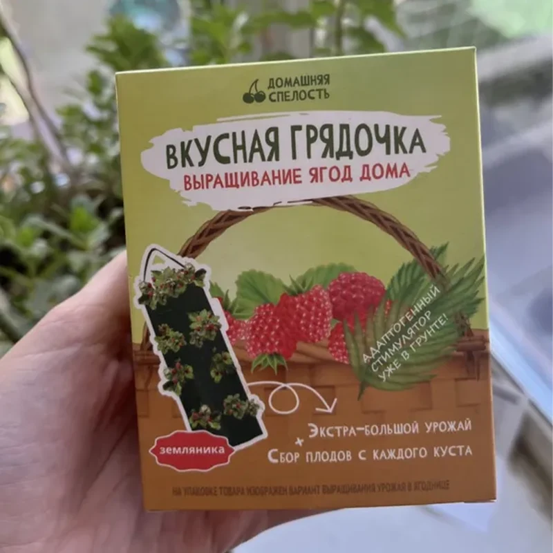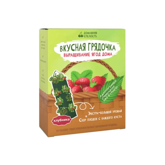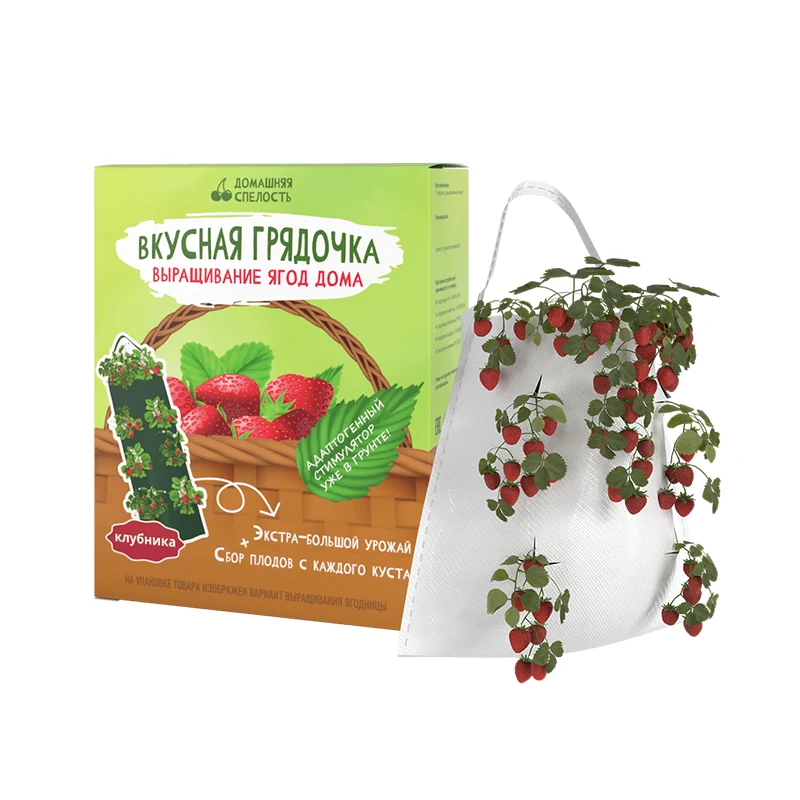 Вкусная грядочка представляет собой уникальную конструкцию, с помощью которой можно круглый год наслаждаться свежей и вкусной клубникой. В фермерский набор входят вертикальная подвесная грядка-мешок для выращивания большого количества урожая. Такие мешки-грядки хорошо подходят для маленьких тесных помещений и удобно размещаются подвесным способом. Грунт обогащенный натуральными адаптогенными стимуляторами роста и семена быстрорастущего сорта.